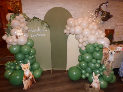 A forest colored balloon photo backdrop with baby forest animal cutouts