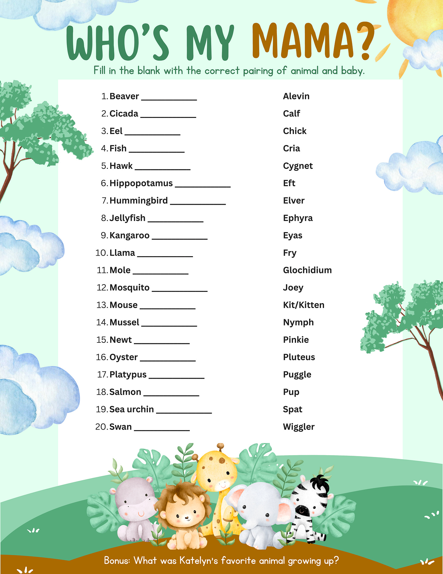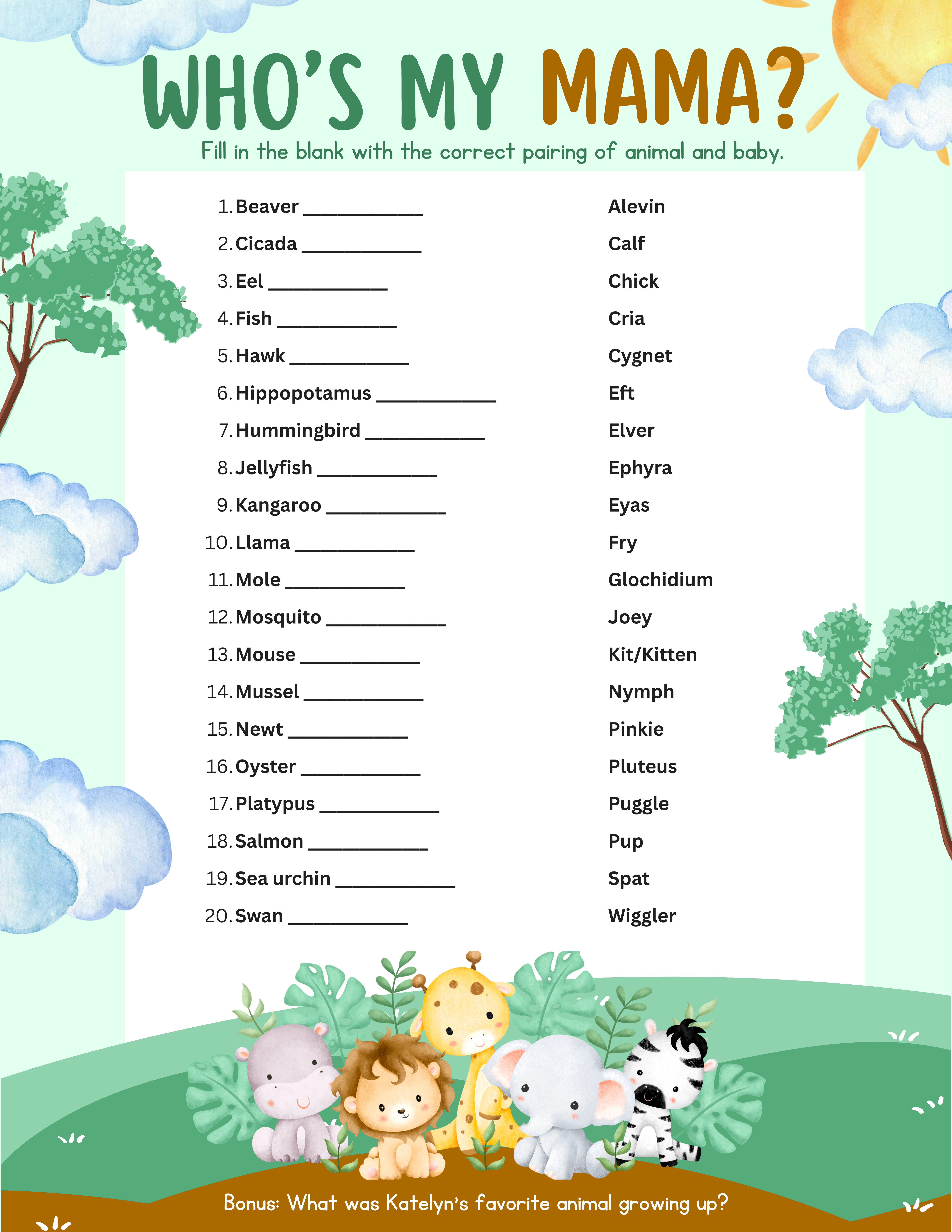 Match the animal with the name of its baby