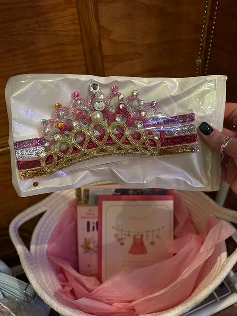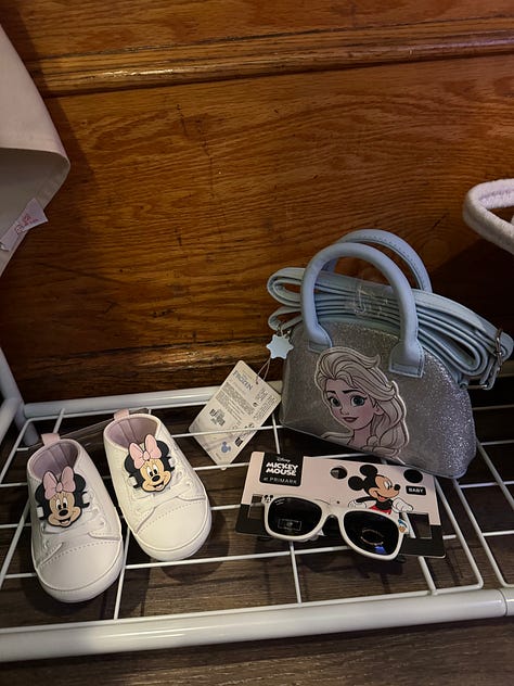 I also got her three princess books, two of which are about my sister’s favorite princesses, and one to show her what each princess can teach her. I put these in a basket on the bottom shelf alongside baby headband tiaras, Minnie shoes, Mickey & Friends sunglasses, and a sparkly Elsa purse.