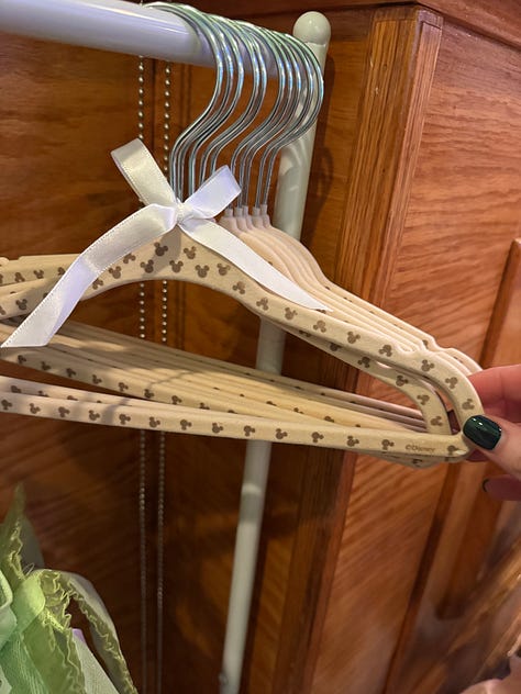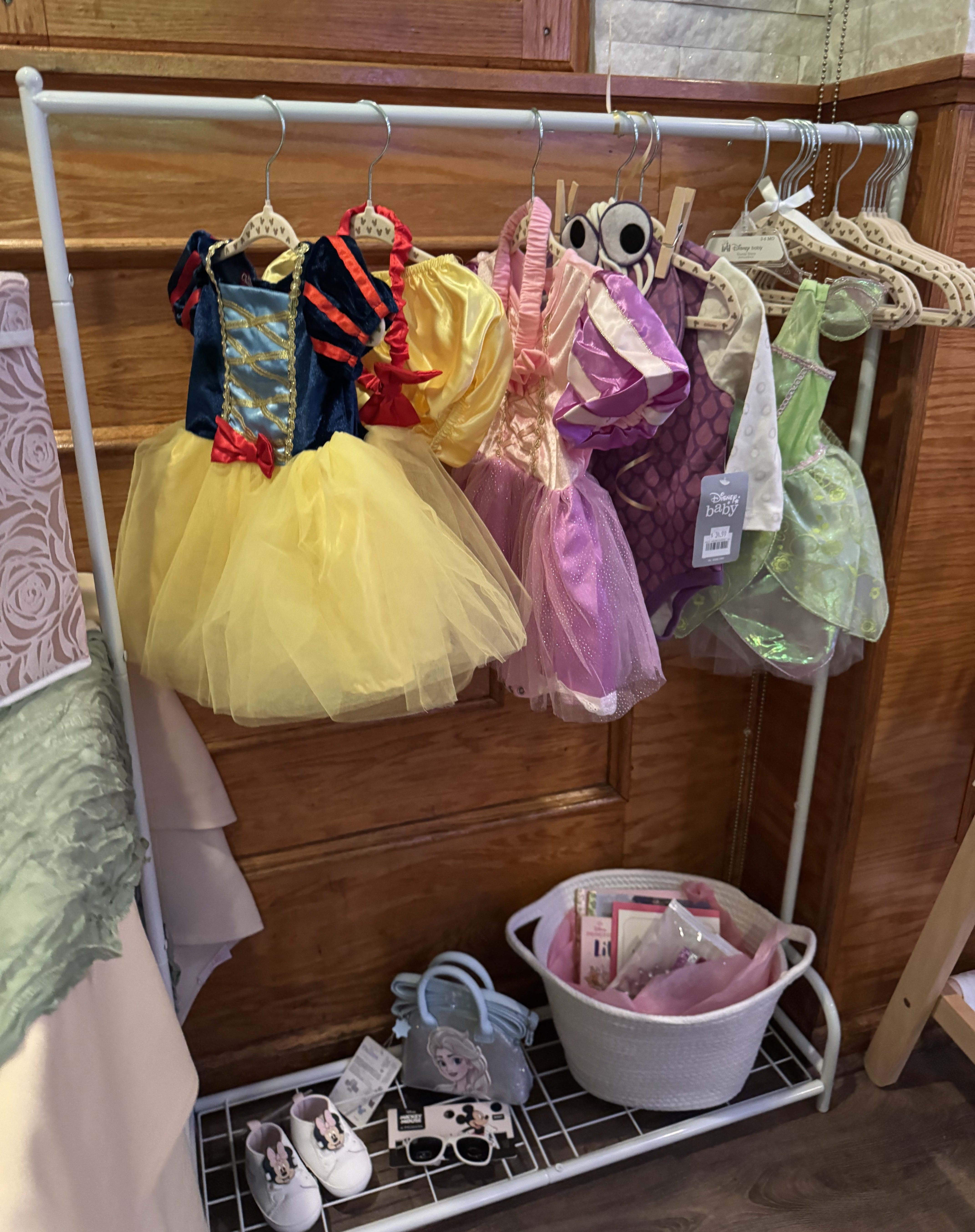 I hung them all on a small clothes rack with baby hangers adorned with Mickey heads in the hope that when her little girl gets older, she can have an actual dress up station in their house.
